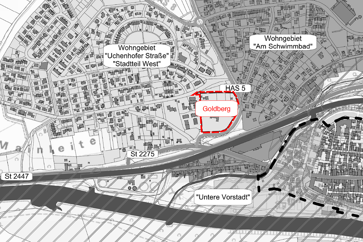 Das Wohngebiet GOLDBERG in der 20 km östlich von Schweinfurt gelegenen Kreisstadt Hassfurt am Main ist durch seine Flächengröße von 16.000 m² ein ganz besonderes „Objekt-Schmuckkästchen“. In der heutigen Zeit ist eine gute Verkehrsanbindung mit einer erstklassigen innerstädtischen Lage GOLD wert. Fußläufig zur Altstadt und zum Main, beste Infrastruktur und ein hoher Naherholungswert - dieser neue „Wohnstadtteil” bietet ausgezeichnete Entwicklungspotenziale für Investoren und Bewohner.